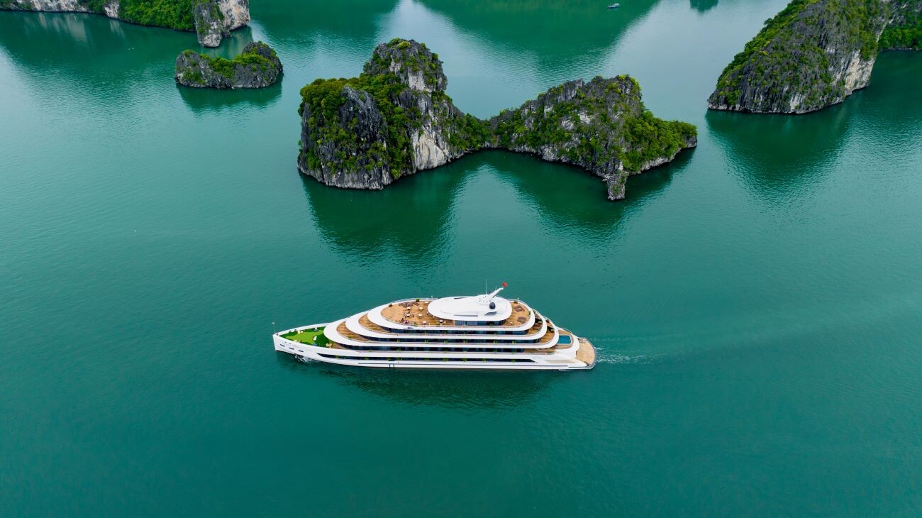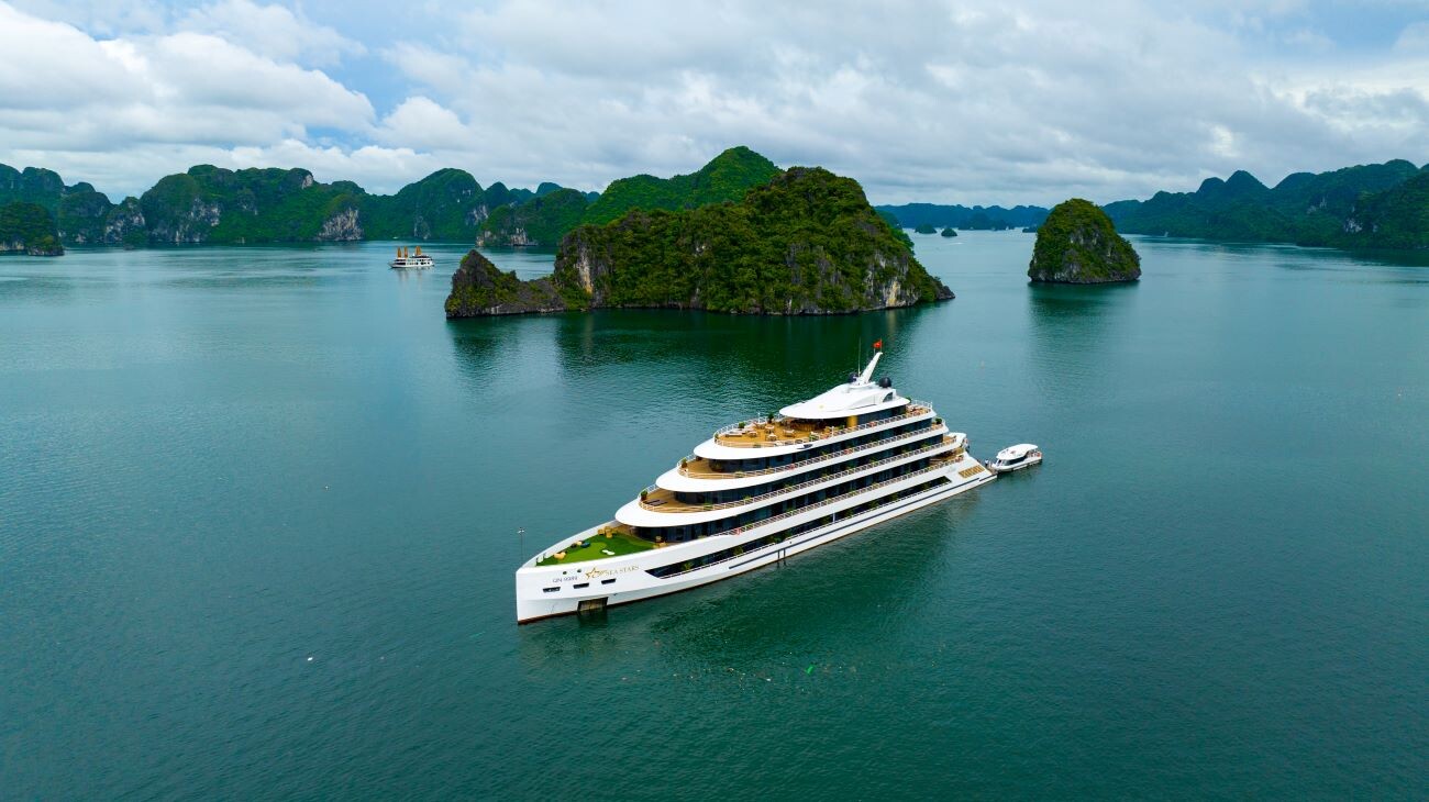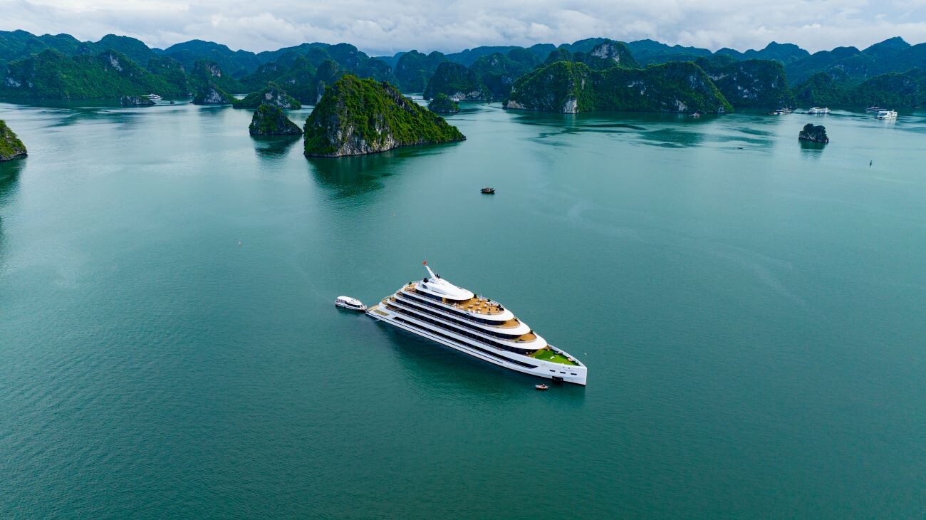 An aerial view of the ultra-luxury cruise docked at Halong Cruise Port, ready to welcome guests aboard.